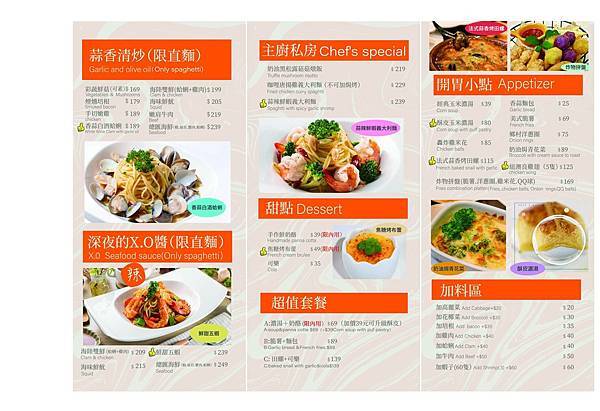 餐點主要分為紅醬、青醬、白醬、粉紅醬、蒜香清炒、XO醬和單點