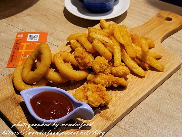 炸物拼盤內有洋蔥圈、雞米花和脆薯
