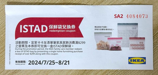 3.IKEA ISTAD保鮮袋兌換券,要消費$299才能兌換,懶得去換