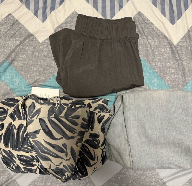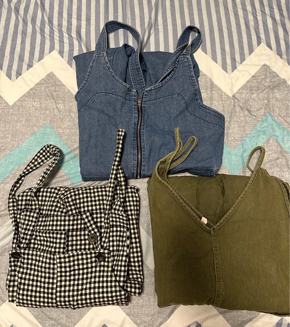 B.花花連身洋、灰色A字裙、9分微喇叭褲