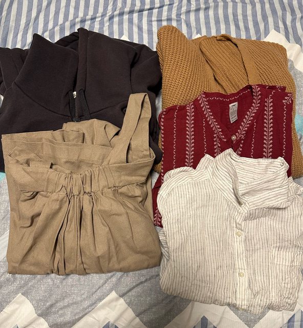 C.灰色長版鋪棉外套、吊帶寬褲、卡其針織外套、七分袖襯衫(紅)、無印直條紋襯衫