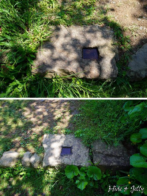「水手御門跡」的石階梯旁的兩顆門柱孔,清晰可見,連前一天大雨的積水都還沒乾呢。