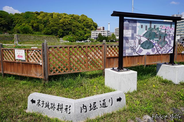 在國道9號久米町十字路口處右轉,就可以看到米子城的案內板以及米子城枡形的指標,