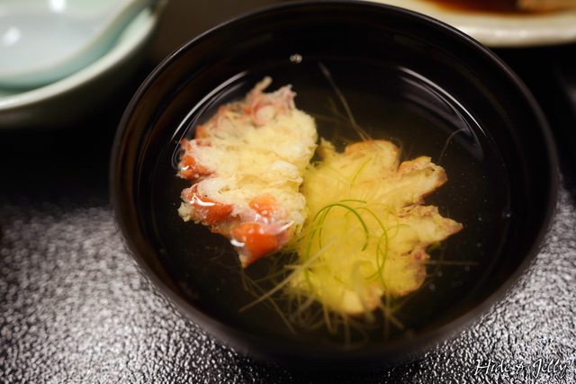 搭配釜飯的是蟹肉清湯,這沒有理由不好喝的啊,我們連湯裡的蟹身都吸吮到乾淨,名符