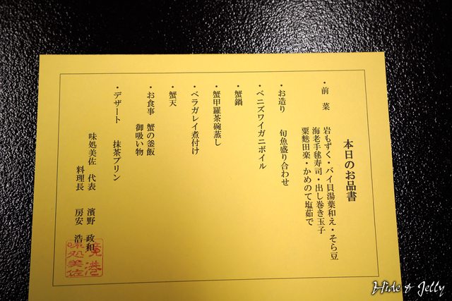 今日菜單,我們點了6,600円/人的紅楚蟹套餐,總共有8道料理,加上甜點,可以看到不