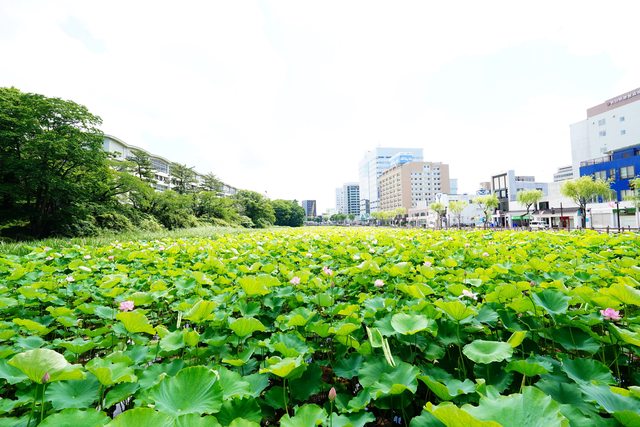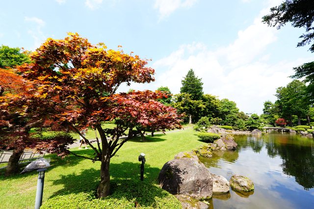 6. 千秋公園。旁邊有蓮花池,夜間會打各種不同顏色的燈光當作展示,公園二之丸剛好 有秋田犬拍照活動,每天有不同的秋田犬會跟民眾見面互動,不過天氣太熱秋田犬的活力 不足,但依舊不減其可愛程度