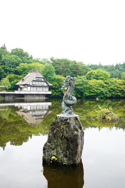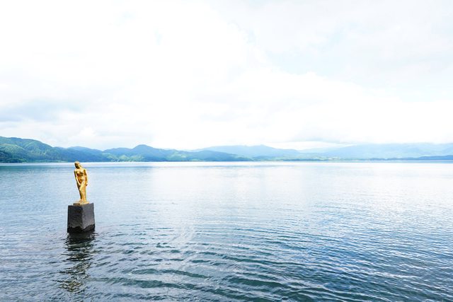 2. 田澤湖辰子像。算是舊地重遊,上次來的時候田澤湖水少,可以站到辰子像旁拍照, 這次因為梅雨影響銅像在水中,但景色依舊美麗