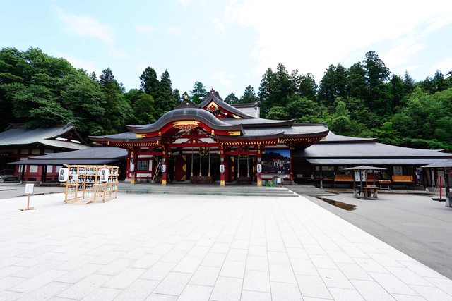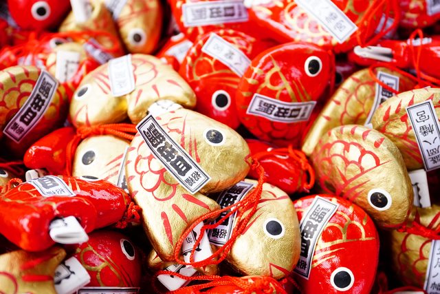 3.盛岡八幡宮。腹地廣闊,供奉多達12座神社,神社前有設立供民眾自拍的腳架;在木箱 裡有許多鯛魚形狀的預言籤詩,可使用釣竿釣起;御守設計也十分多樣化,單一主題就有 好幾種不同的外觀,但也比其他神社的價格高上一些,