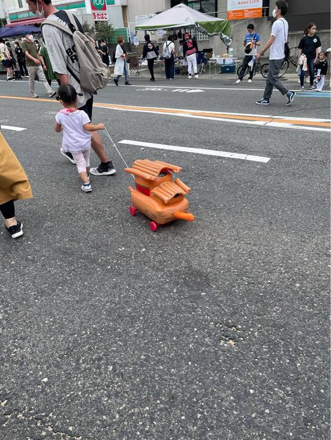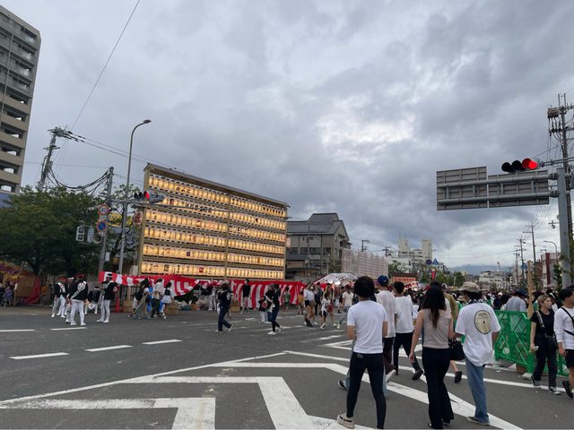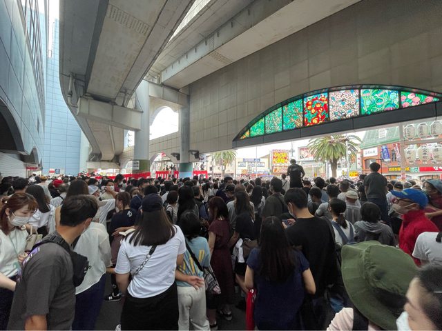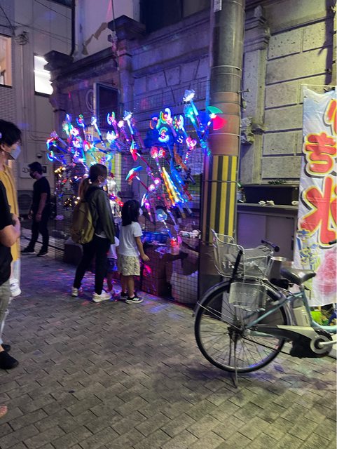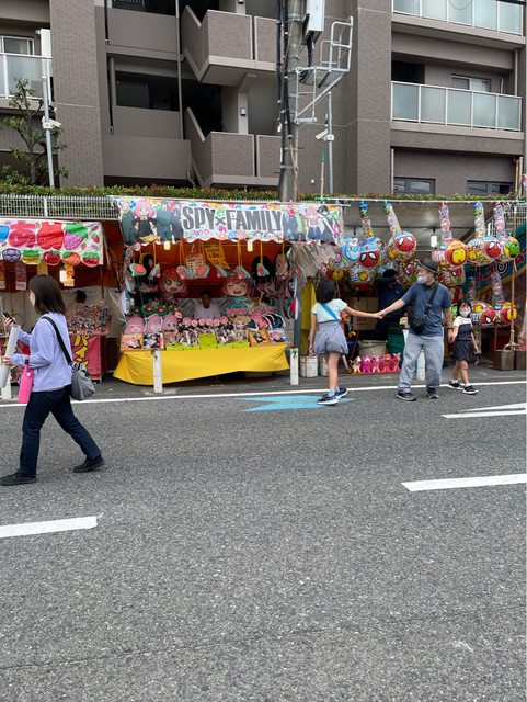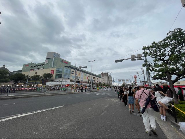 車站旁有零星祭典攤販,隨著人流走著走著就到了被封鎖的大路,攤位綿延,這裡等一下