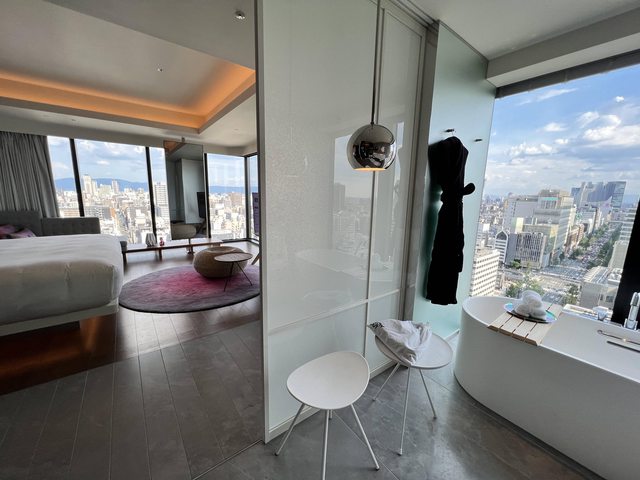 驚奇套房空間很大,有獨立客廳、衣物間、臥室以及分離的浴室和廁所。臥室位在角落,落地窗向外望去可俯瞰大阪市景,美不勝收。廁所是在衣物間旁獨立的一間,不在浴室內。浴室也有一片落地窗,可邊泡澡邊欣賞市景,非常喜歡這間美麗的套房,真的是又大又舒適。