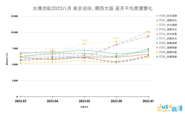 針對台灣虎航及樂桃航空在 東京成田、關西大阪 這兩條航點,出發月在八、九兩月於近