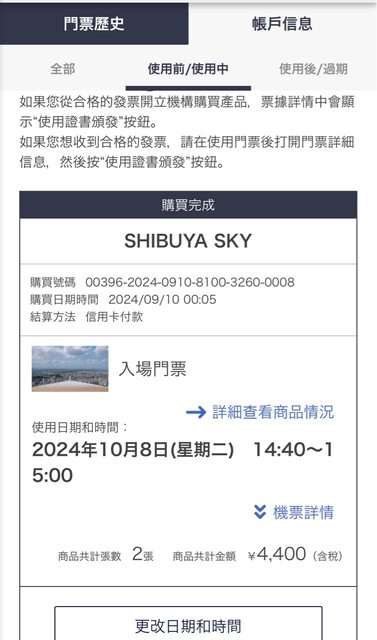 標題[讓售] 10/8 shibuya sky門票*2