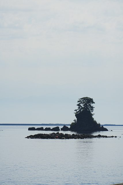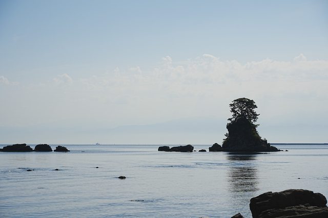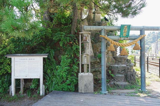 義經岩,據說源義經曾在此停留等雨停,雨晴的地名也由此而來