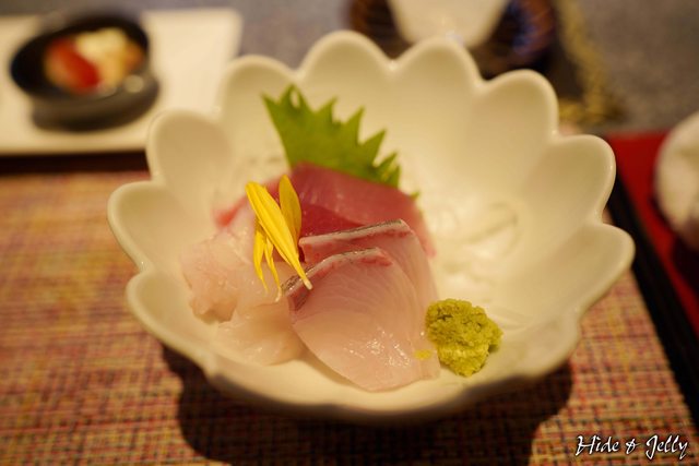 接著是4種魚的生魚片,最前方的帶皮鯛魚,油脂豐厚,超級甘甜,令人印象深刻。裝生