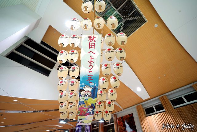 田新幹線內裝相同的原木色調外,秋田的竿燈也掛上了車站天花板,每年八月初的竿燈祭