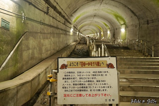 階梯的最下層,有著土合駅的各種數字,下行月台層的標高是海拔583公尺,雖然看起來