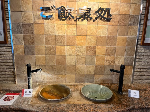 換上浴衣,先去體驗溫泉。去大浴場的途中會經過大廳9米高的大金棒及飲泉處、還算適