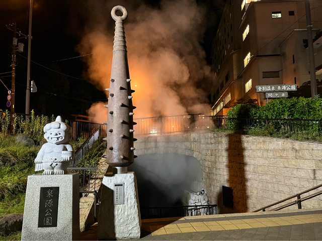 我們搭13:45的巴士,約20分鐘抵達第一滝本前站。下車處旁就是源泉公園,有間歇泉會