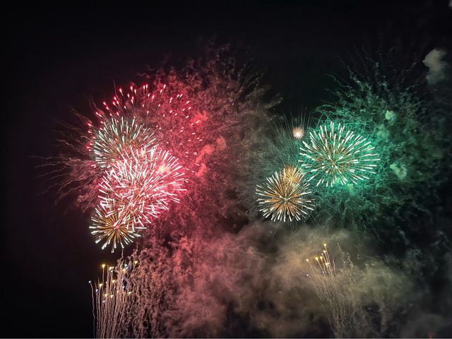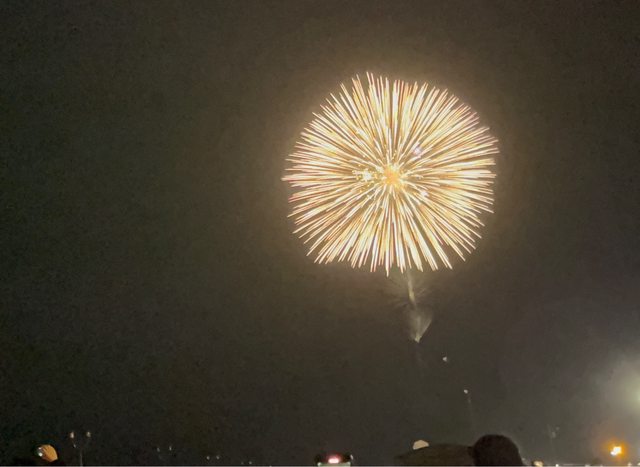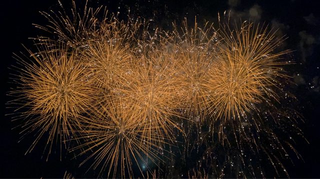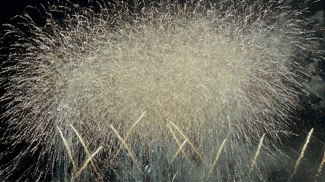 驚呼聲及掌聲中,先有一些煙火以五彩繽紛的花朵綻放,到最高點時炸開、金黃色的光芒