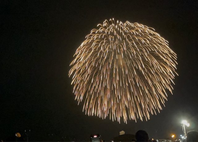 最特別的就是中場時施放的三尺玉。現場觀眾聽到主持人的介紹,都把身體向右轉90度、