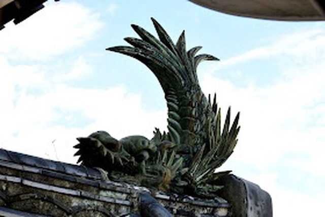 察在入母屋破風的上方有著和頂樓屋脊一樣、龍頭魚身造型的鯱。