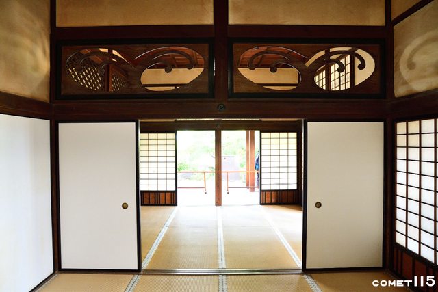 花板之間還有稱做「欄間」的構件。欄間有源自平安時代的竹節造型,也有象徵當地黑潮