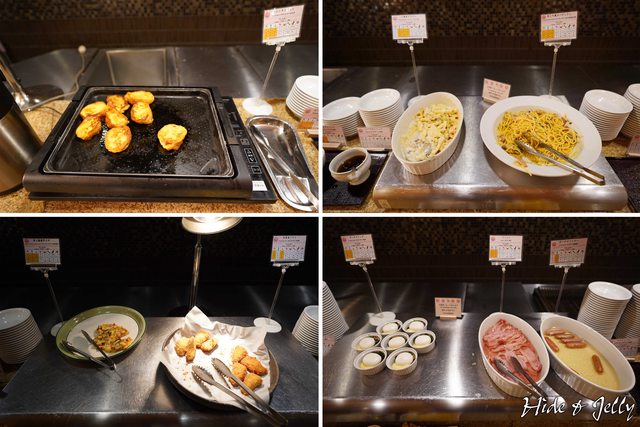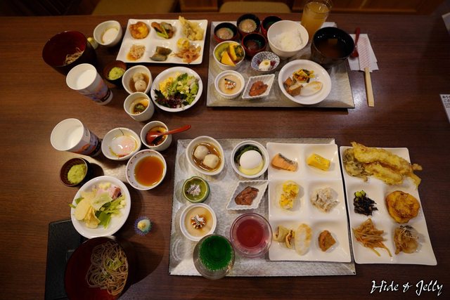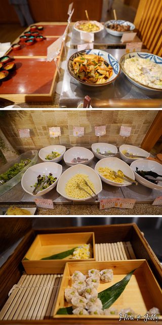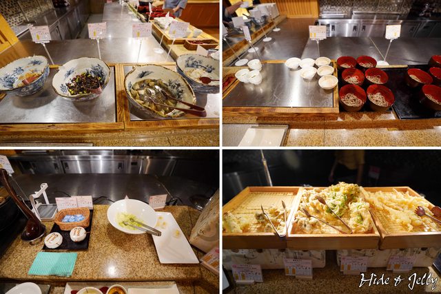 接著就是眼花撩亂取餐時間,有和式小菜(左上),溫泉蛋、豆腐、蕎麥麵(右上),麵類配