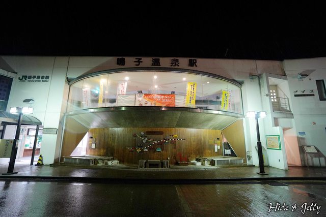 我們往鳴子溫泉駅前進,看看白天沒有看到的車站外觀。兩層樓的站體,上方有弧形大面