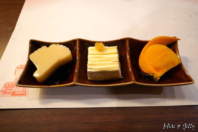 結尾的甜點與水果真的很秋意,左邊是白巧克力羊羹,特地做成銀杏的造型,口感很棒,