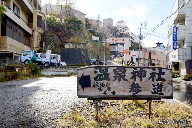 沿著「湯の街道通り」,快到車站的位置,才在路邊看到「溫泉神社參道」的指標。