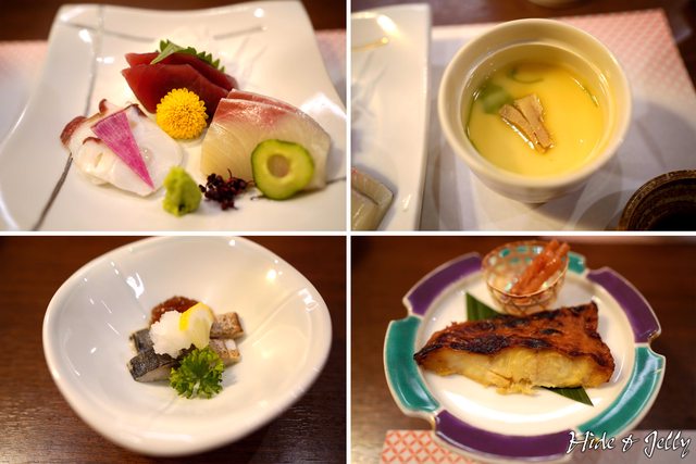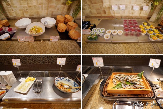 玉子燒與筑前煮(左下),烤秋刀魚(右下),甜點與水果區(左上、右上)。