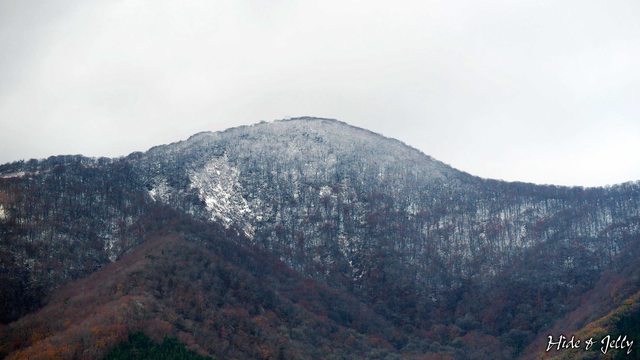 拉近一點看,沒錯,真的下雪了,遠方可能是栗駒山系的神室山,一夜裡就白頭了,秋天