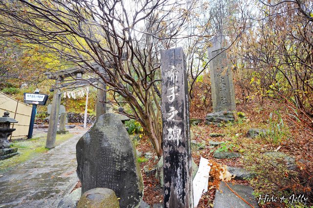 走下樓梯轉個彎,可以看到溫泉神社的另一個鳥居以及石碑,一旁的「啼子之碑」感覺也