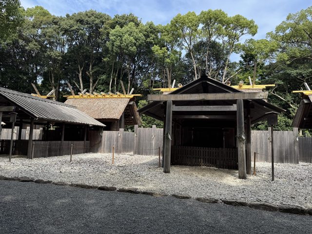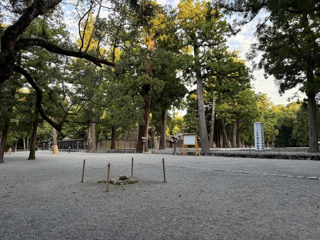 內,四周都是很高的樹木,最裡面就是正宮,旁邊有一塊空地是遷宮用,參拜的人穿過鳥