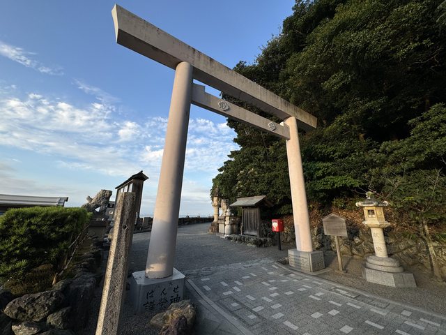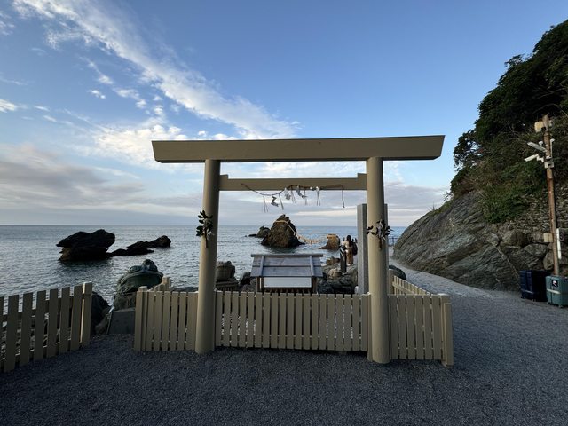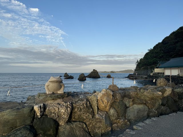 李只能提著走,經過社務所與拜殿後就可以看到在海中的夫婦岩,傳統參拜伊勢神宮就