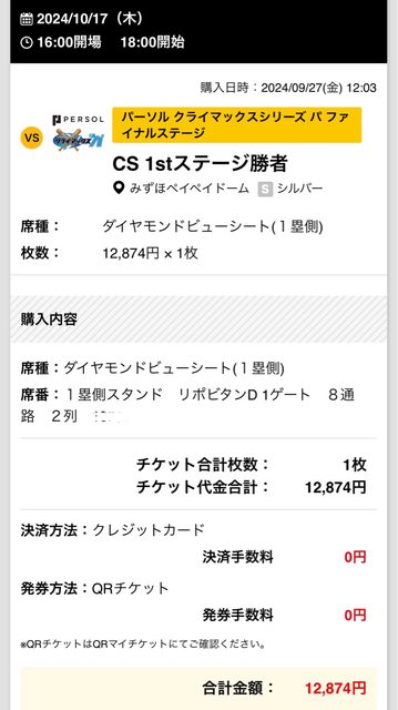 10/17 福岡巨蛋 ダイヤモンドビューシート 一壘側 X1