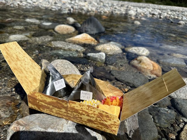 中午11點多在明神橋下河畔吃飯店準備的飯糰休息欣賞美景