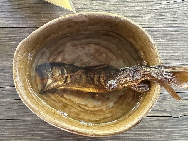 本來想說點個烤魚配清酒的,但我誤會了點餐機的選項,來的是烤魚乾再澆上整碗的清酒