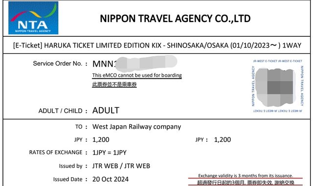 標題[讓售] haruka 關西機場→大阪/新大阪 單程票2張