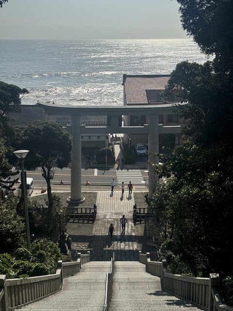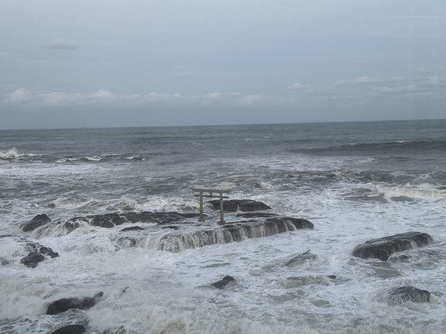 過馬路對面就是大洗磯前神社大鳥居,旁邊是好像蠻有名的高級溫泉飯店里海邸,但考量