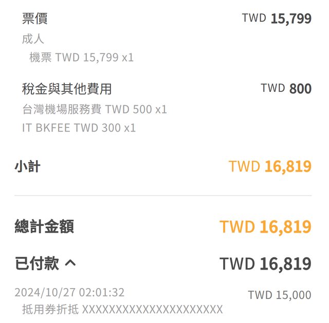 : 回去訂單詳情頁面看才發現,機票兌換券只幫我折掉 TWD 15,000,我多付了 799