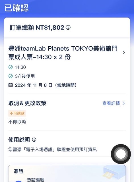 1. 讓售品項:11/08 14:30 東京豐洲 teamLab Planet 二個大人