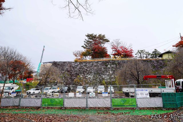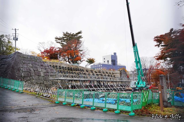 準備回到盛岡城西側的巴士亭,這時看到吊車升起正準備工事,一整面的石垣被卸了下來