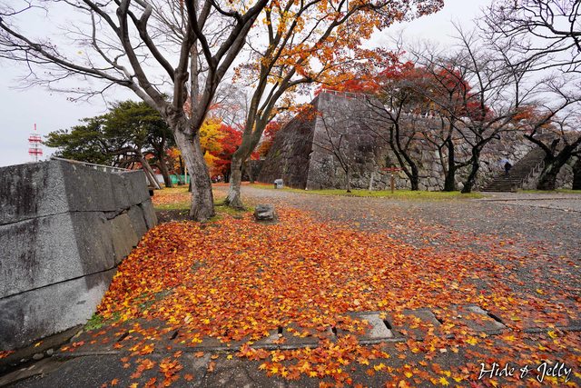 走到本丸東側的淡路丸,這裡也有漸層的楓紅,左側後方的石垣,就是盛岡城的天守台。