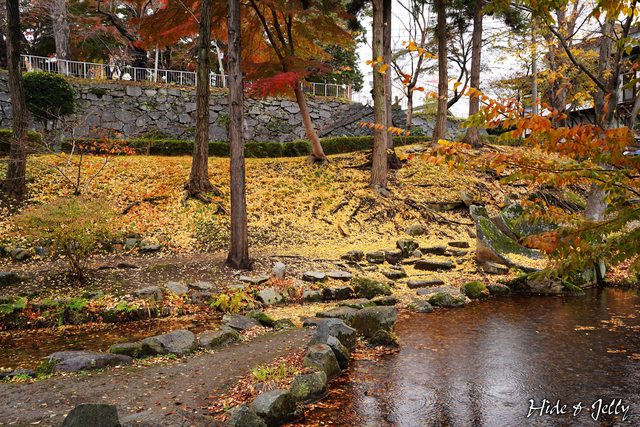 台所屋敷跡東側,則有過去為盛岡城水堀的「鶴ヶ池」,一旁還有一棵金黃葉子尚未掉光