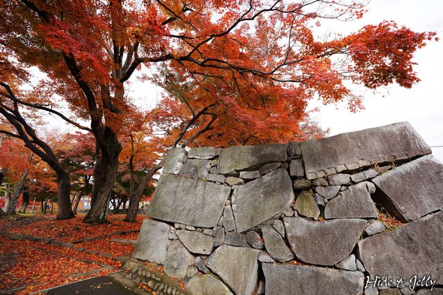 楓紅搭配盛岡城石垣,也是古城專屬畫面。(此處石垣為本丸石垣)