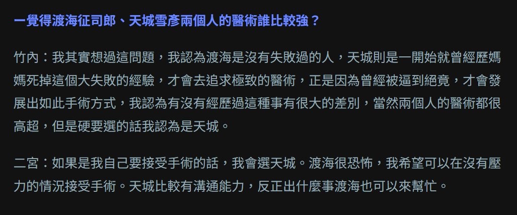 推 u10400068: 話說佐伯說渡海為了救德永一直在鑽研直接吻合術,但直 09/18 13:06