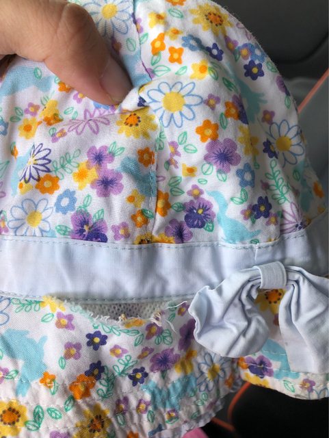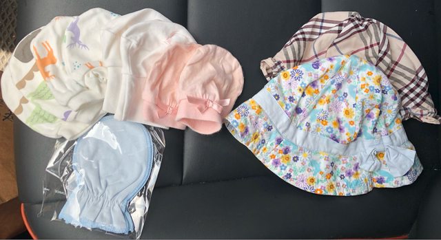物品狀況:幾乎都是二手,全新僅藍色手套。其中一個花花帽子近蝴蝶結旁有一處破損(