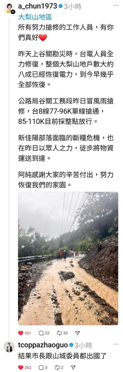 → ceca : 明霸克路橋那個本來就是斷的,還沒重建好又被沖掉. 07/27 16:07