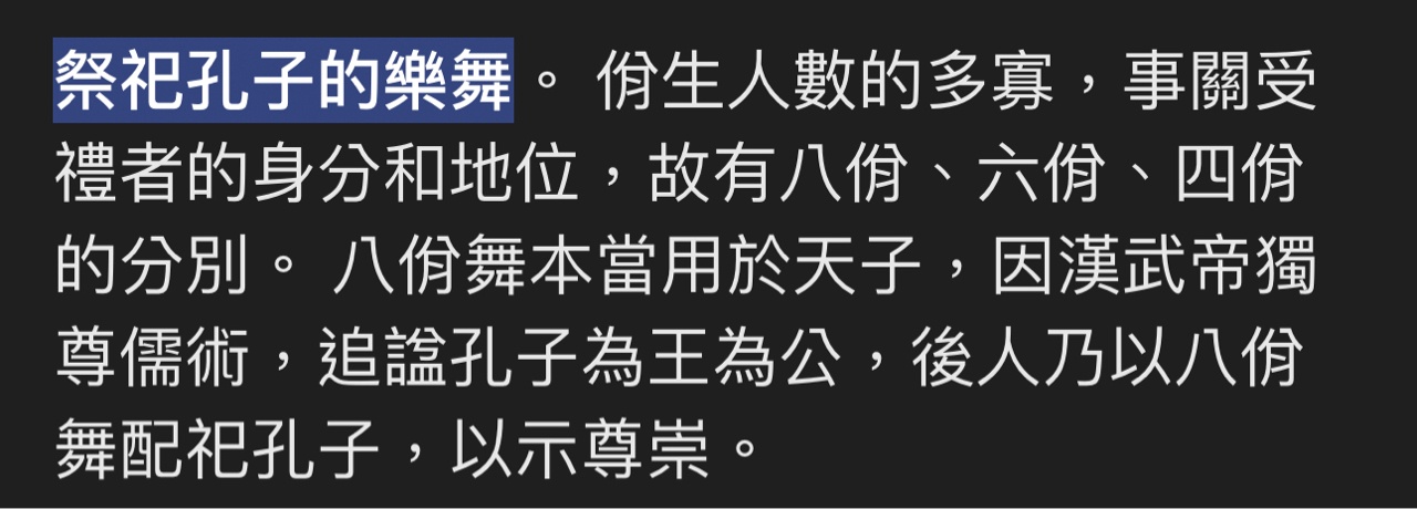 推 mysister: 是這個包養平台嗎 09/29 09:42 推 lupins : 周天子才能用八佾。祭孔(非天子層級)是用六佾。 09/29 14:12